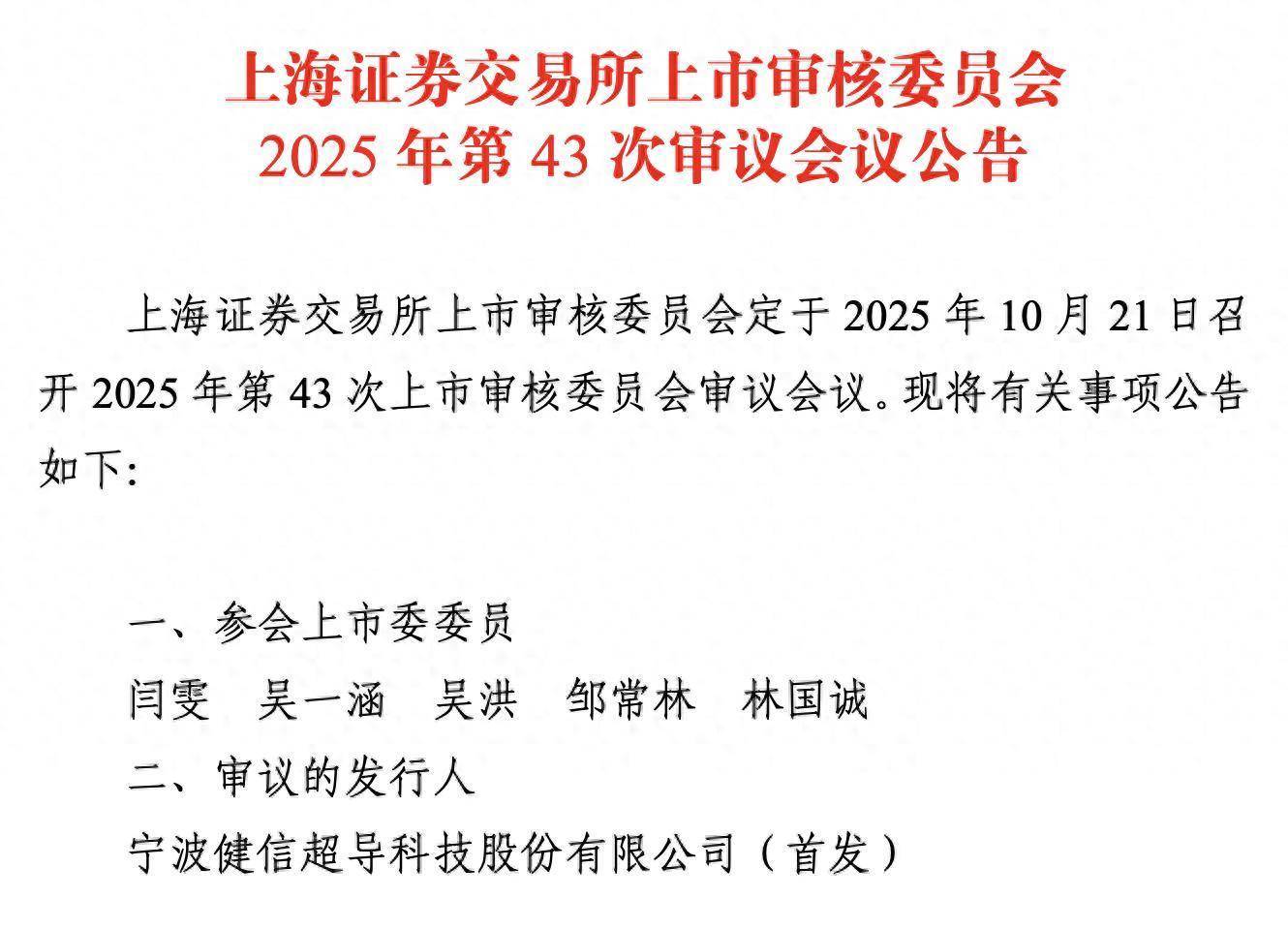 10月14日,上交所官网显示,宁波健信超导科技股份有限公司(简称“健信超导”)科创板IPO将迎来上会审核,时间定于10月21日。