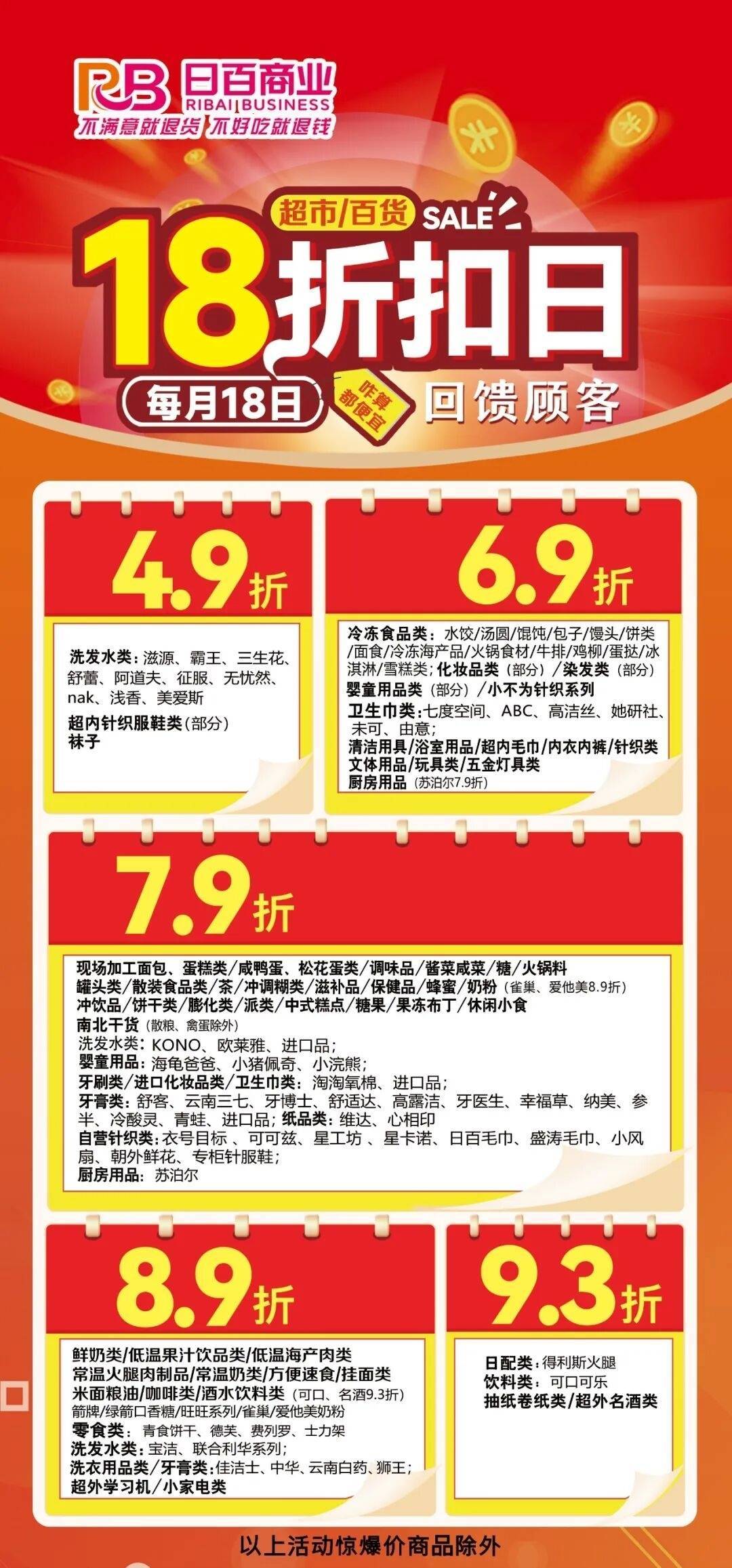 凡在日百商业超市购买食品类商品,不好吃就退钱,生鲜食品24小时内、常规食品7日内持购物小票及商品至门店总服务台办理(烟、保健食品除外)。